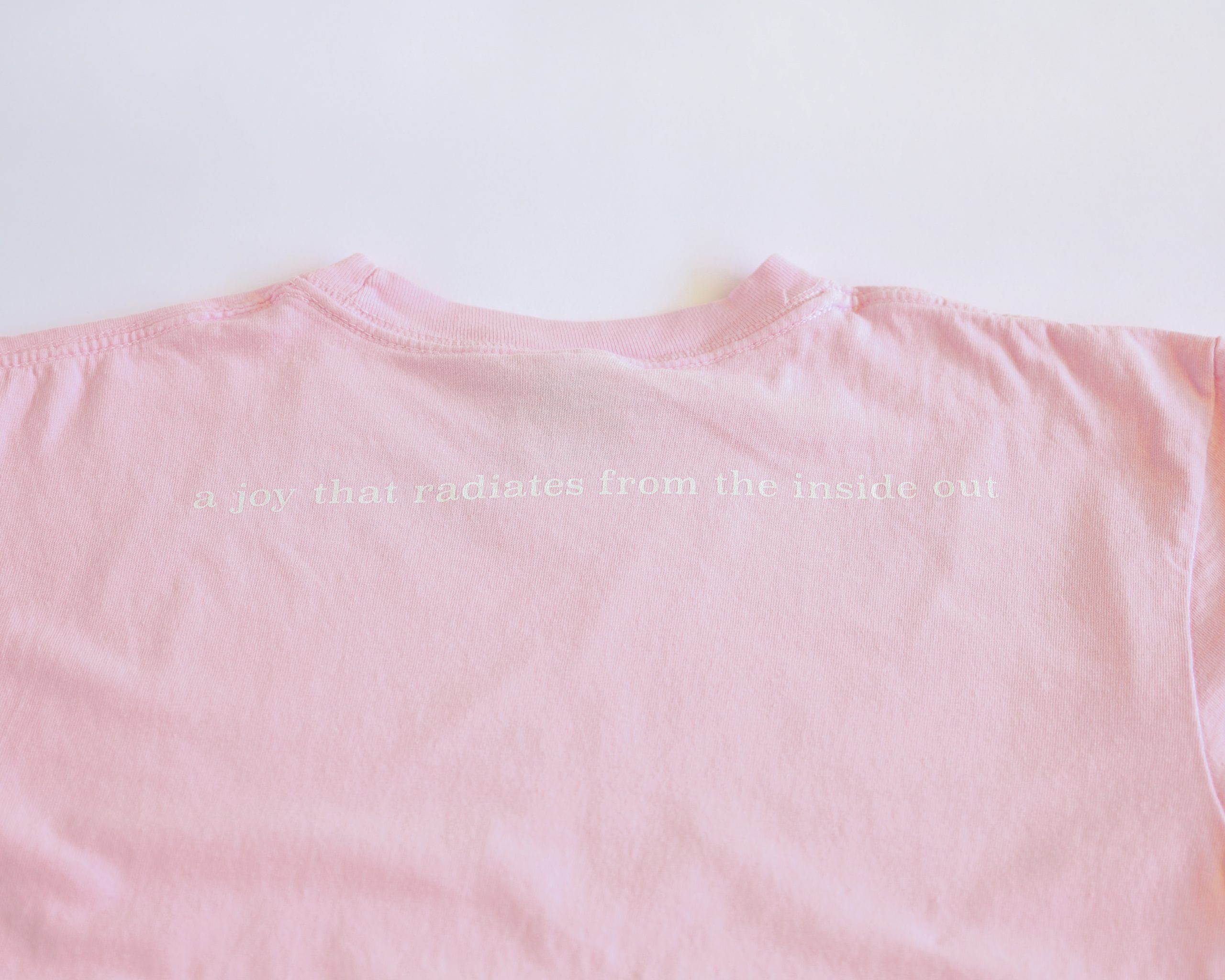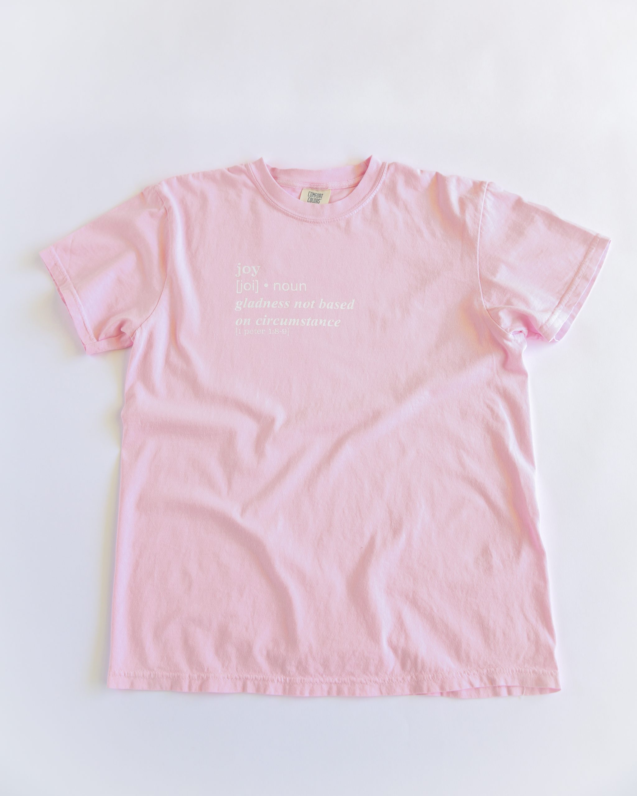 1 Peter 1:8-9 says, “Though you have not seen him, you love him. Though you do not now see him, you believe in him and rejoice with joy that is inexpressible and filled with glory, obtaining the outcome of your faith, the salvation of your souls.” Nothing compares to the joy that comes from knowing the Lord, and what a beautiful truth it is to know that it can never be taken away from us. Let this shirt serve a reminder to choose joy today no matter the circumstance.